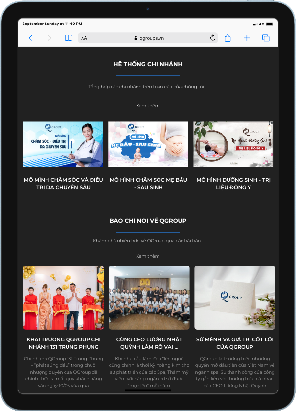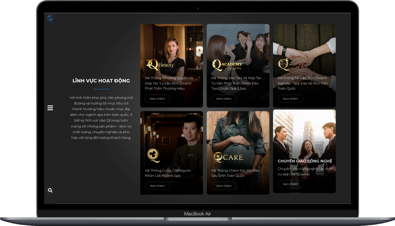 Dự án thiết kế website cho Qgroup, một hệ sinh thái cung cấp các giải pháp toàn diện trong lĩnh vực spa. Qgroup được thành lập với sứ mệnh mang đến cho khách hàng những dịch vụ và sản phẩm chất lượng nhất, đồng thời định hình xu thế mới trong ngành công nghiệp spa. Với đội ngũ chuyên gia giàu kinh nghiệm, Qgroup cam kết mang lại trải nghiệm thư giãn và chăm sóc sức khỏe tốt nhất cho khách hàng.